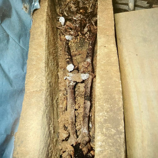 Above L-R; The sarcophagus of Burial 5, an example of Oslo-style shoes and the facial reconstruction of Burial 4.