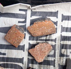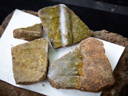 Day 22: We've been making great progress but just as we think we've hit the natural soil base layer some more Roman pottery pops up, in this case the bottom of a cooking pot which has become wedged beneath a boulder. In contrast to the dark clay heavy cooking pot we're also finding pieces of fine hard gloss Samien ware. This high quality table ware was made in Gaul from deposits of illite clay. The smooth red surface was created by dipping the unfired pot into a slip (liquified clay) before it went into the kiln.